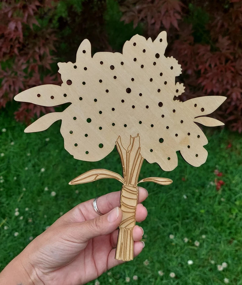 Our wild flower nature walk board keeps your little ones busy, exploring new flowers to make the perfect flower arrangement. Engraved wooden flower collector board as pictured. Perfect for a nature walk, seedlings adventure or sorting activity. Children get to practice threading skills by placing flowers and learning the flowers picked or garden flowers/leaves from their outdoor adventures.